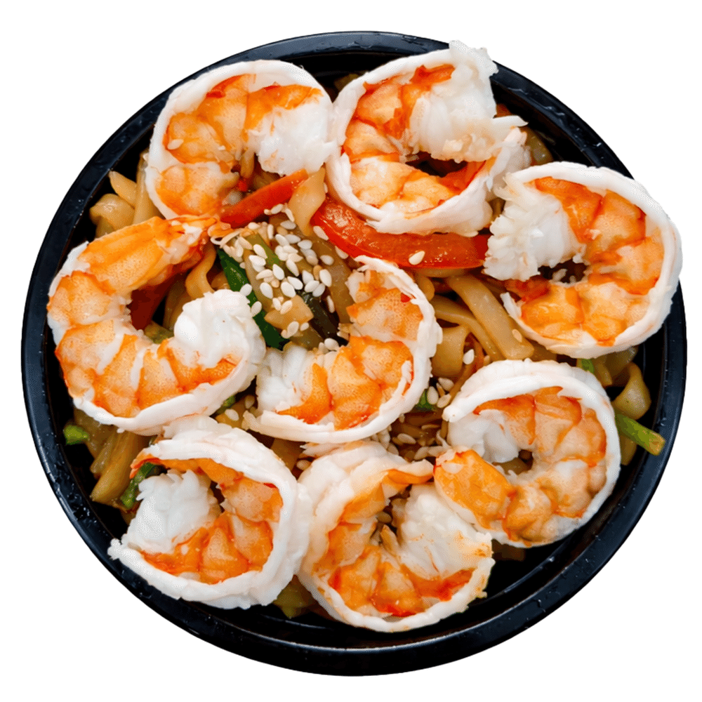 Лапша пшеничная, креветки, овощи, соус устречный.(400 гр)