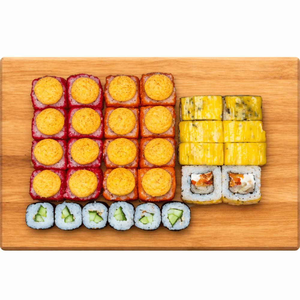Сливочный лосось, калифорния, чикен энд чиз, Мини ролл с огурцом.