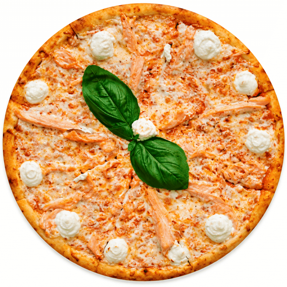 Фирменный соус, сыр моцарелла, сливочный сыр, лосось, свежий базилик.