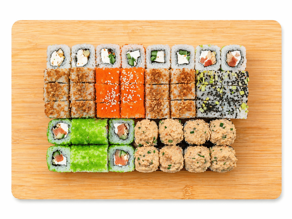Калифорния, Снэк ролл, Сливочный лосось, Карри ролл, Витамин, Чикен спайс. (1122гр)