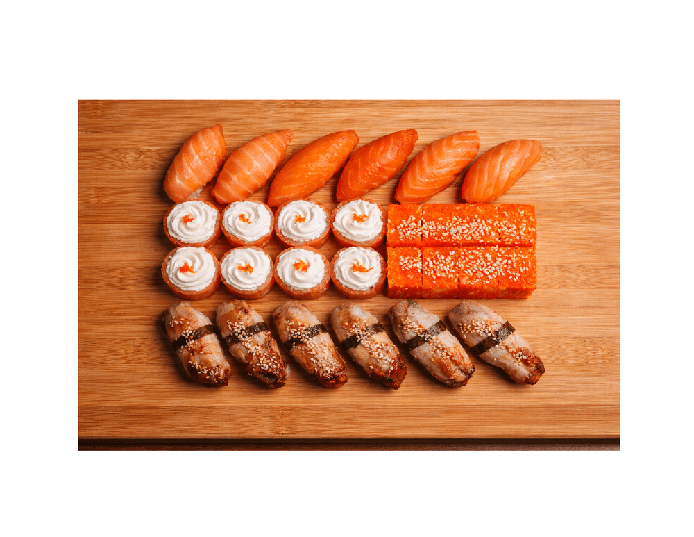Ролл Калифорния с крабом, ролл Филадельфия дабл, суши с угрём, суши с лососем. (878гр)