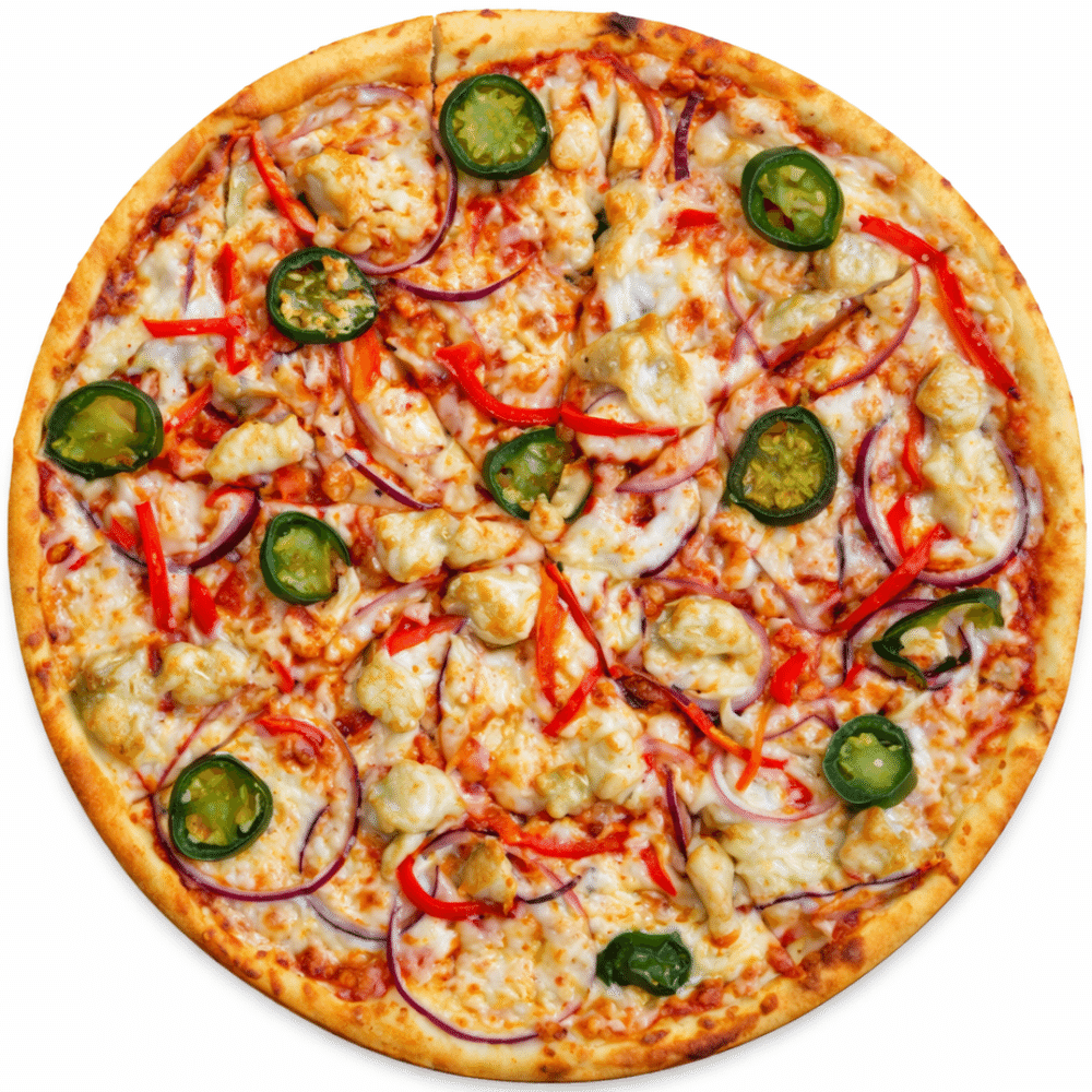Фирменный соус, сыр моцарелла, перец болгарский, лук репчатый красный, халапеньо, куриная грудка.