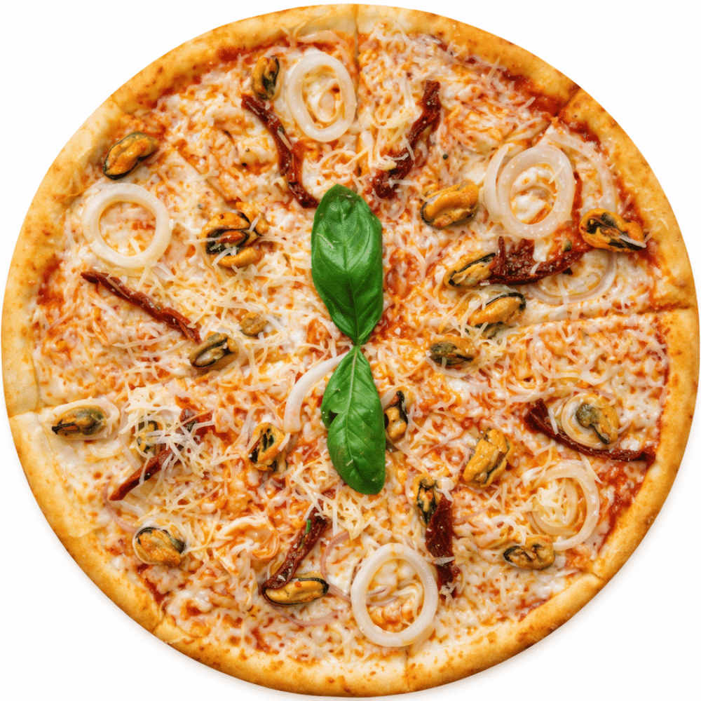 Фирменный соус, сыр моцарелла, мидии, кальмар, креветка, томаты вяленые, лук красный, свежий базилик, сыр Грано Подано, маслины.