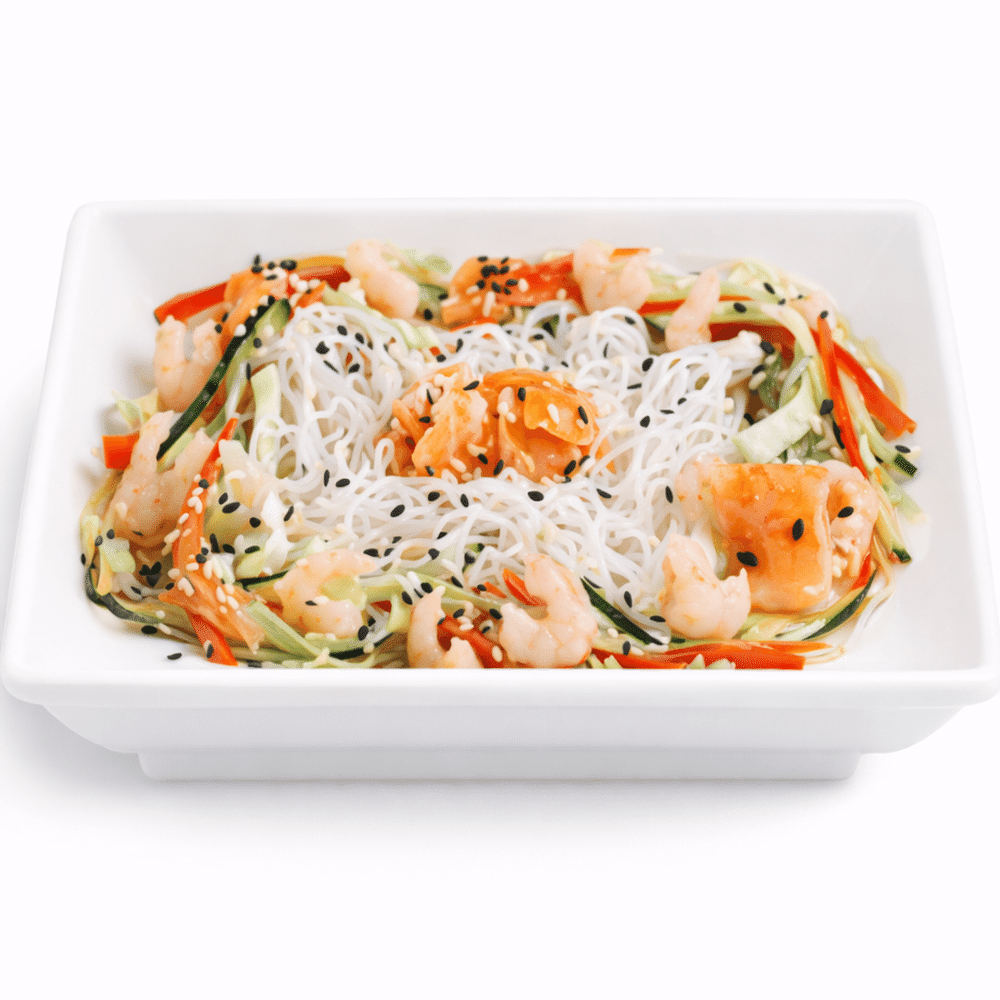 Лосось, хрустальная лапша, соус Дрессинг, огурец, китайская капуста, болгарский перец, креветки, кунжут