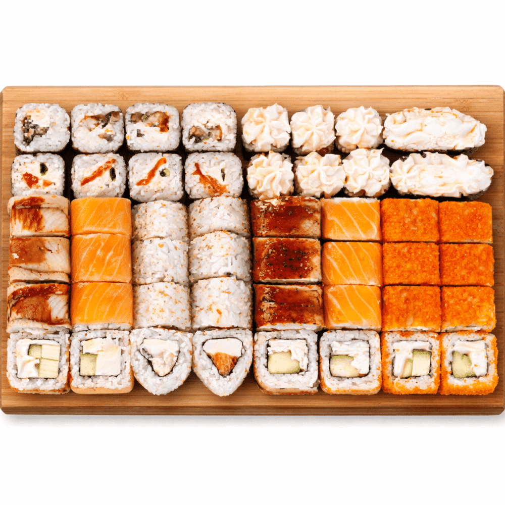 Куримисяке микс, Филадельфия Лайт микс, Филадельфия Микс, Мини Филадельфия Микс, Филадельфия в масаго, Фишкейк, 2 суши со сливочным сыром и креветкой. (1150гр)