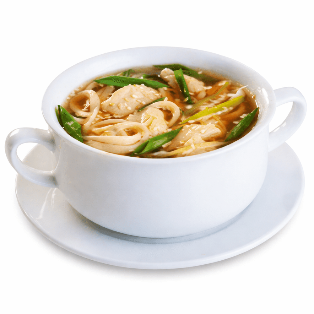 Рыбный бульон, курица, лапша Удон, лук-порей, зеленый лук, кунжут